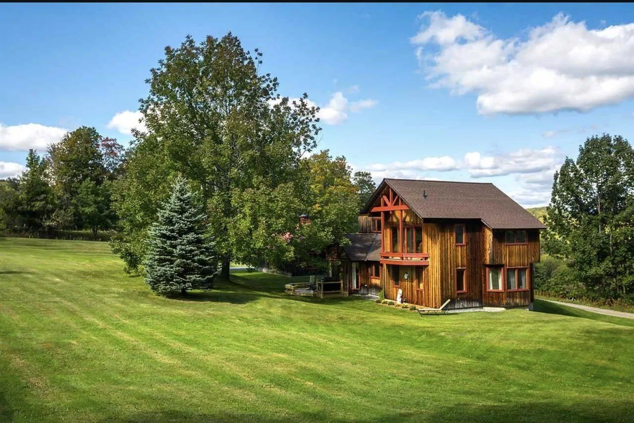 No interior photos are included, but the listing says the 2,562-square-foot space features hardwood floors, black walnut counters, and exposed-fir beams. There is also a timber-framed barn with a shop space and a finished second floor.