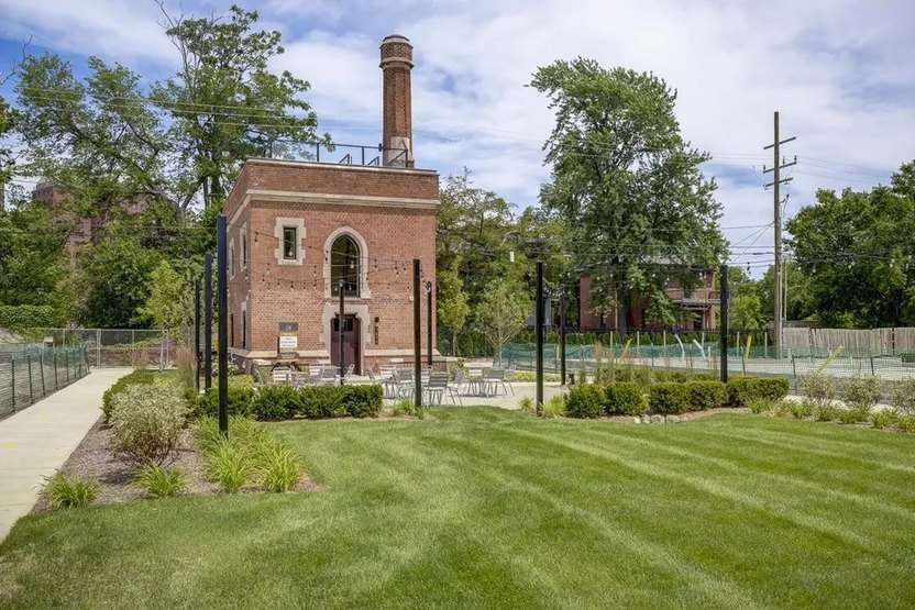 A front entry patio overlooks the community park, while a rooftop terrace provides panoramic views of downtown Detroit.